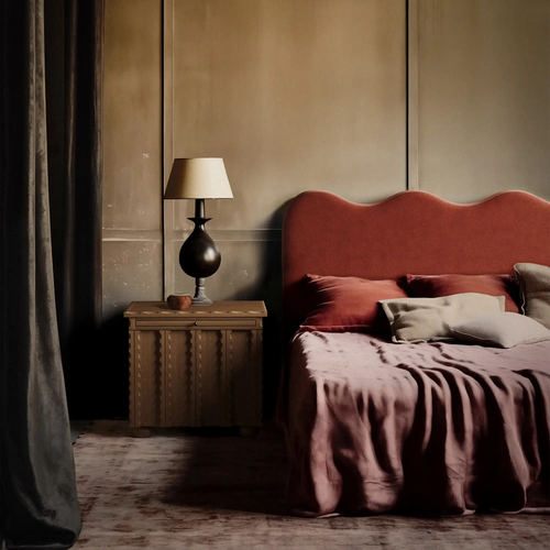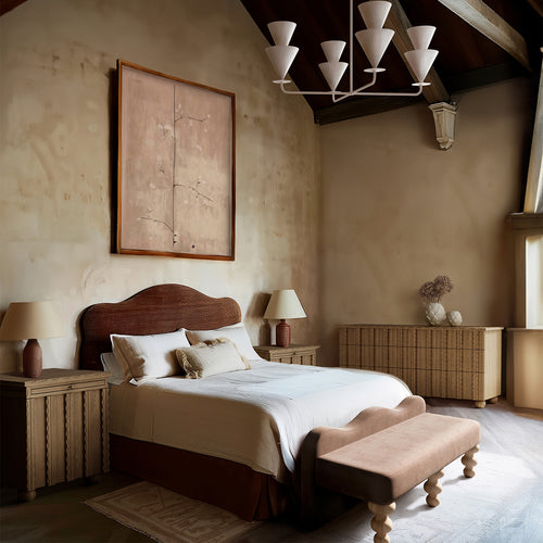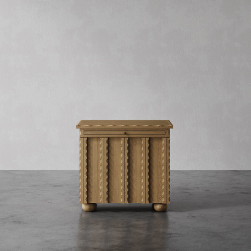 The Marchand nightstand features elegantly scalloped edge detailing and textural door fronts, creating a standout design for any bedroom. Designed for convenience, it includes a pull-out shelf for extra bedside storage and boasts unique custom hardware pulls. The combination of intricate detailing and functional design makes the Marchand nightstand a perfect addition to your bedroom, offering both beauty and practicality. Crafted with attention to detail, this nightstand brings a refined aesthetic to your space.