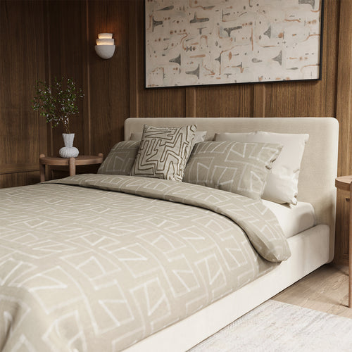 Elevate your bedroom decor with this gorgeous Mareé duvet set embellished with intricate geometric embroidery. The duvet cover serves as a canvas of shapes, meticulously stitched in a modern pattern that adds a touch of sophistication to any space. The precision of the embroidery work is a celebration of the craftsmanship in the design. Made from sumptuously soft bamboo-linen blend fabric, this duvet set not only adds a luxurious aesthetic to your bedroom but also ensures a cozy and restful night's sleep.