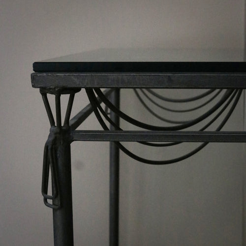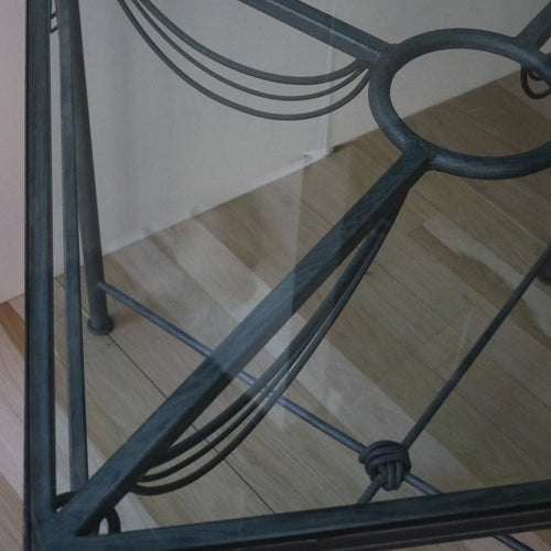 This particular table features a minimalist glass top balanced by a visually rich wrought iron base, finished in a dark patina. Underneath the tabletop, swooping iron rods drape gracefully from the corners in a style reminiscent of neoclassical swag motifs—one of Villa’s hallmark decorative gestures. The structural legs are connected by crossbars that converge in a sculptural knot at the center, combining strength with symbolic artistry.