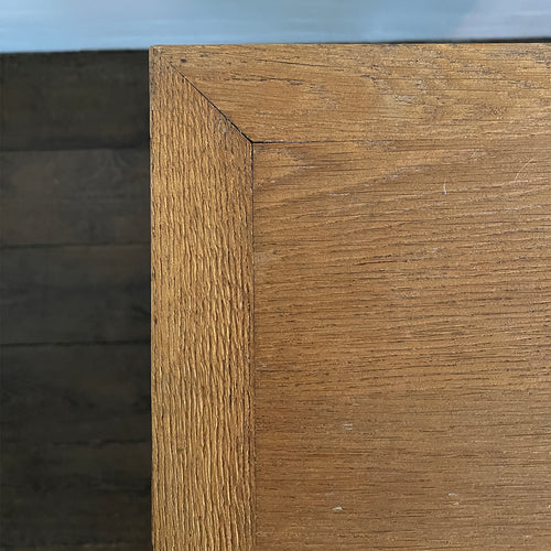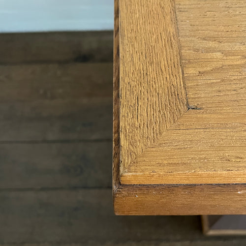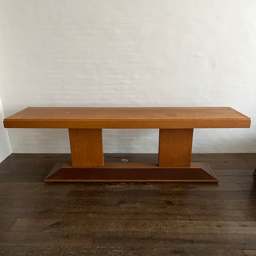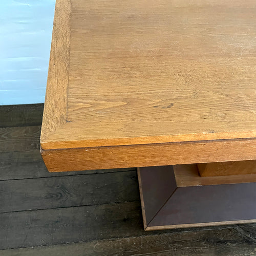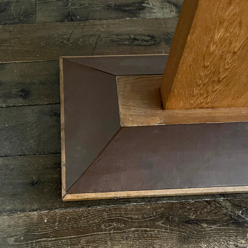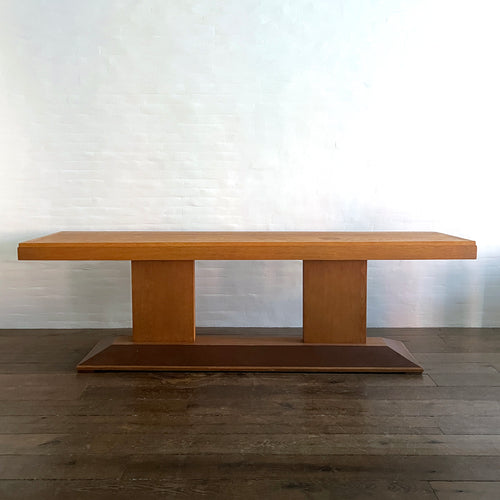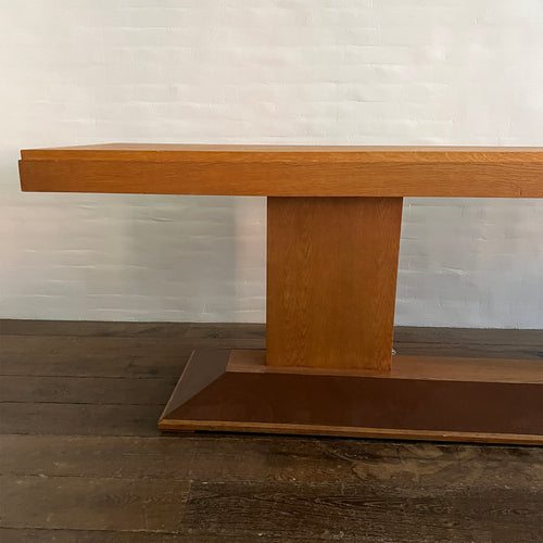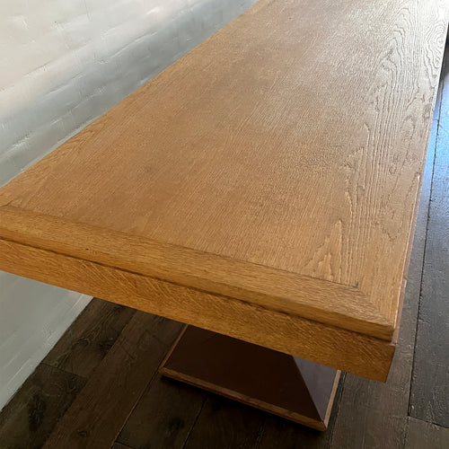 This beautiful and architectural antique console was sourced and and made in France and estimated to be from the 1940's. The oversized piece is made from natural French oak with an appropriately aged patina and a very handsome leather detailed base. This gorgeous piece can be viewed in our atelier, and is available now for local pickup and delivery.