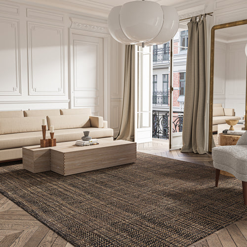 The quality of the line pattern sets the Moghar Collection apart. A handwoven jute flatweave, the subtle gradations of color work together to create an elevated basic. Built for layering, the wonky lines and irregular texture all have a very organic, hand-stitched quality, adding beautiful texture to your surfaces.