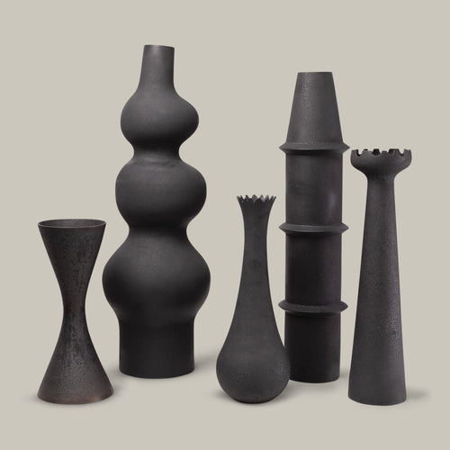 The Overscale Vases in Black combine scale and organic form for decorative drama. Whether alone or in a grouping, these vases are the perfect graphic elements to complement any decor. Listed from left to right as shown in the image: Deoune Vase, Pasteur Vase, Fenouil Vase, Panisse Vase, and Muguet Vase.