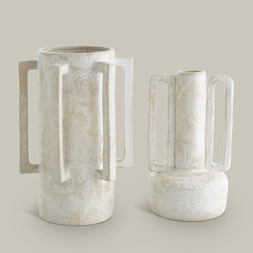 The Normandie and Bretagne Vases showcase a unique and modern design that effortlessly blends functionality with artistic beauty. The vases feature multiple square-shaped handles, adding a geometric and sculptural element to its overall aesthetic. With its sleek silhouette and impeccable craftsmanship, these vases becomes a captivating centerpiece, elevating any floral arrangement or standing alone as a contemporary work of art. Available in three washed finishes - light grey, dark grey, or natural. Hand-wash. Product is Watertight.
