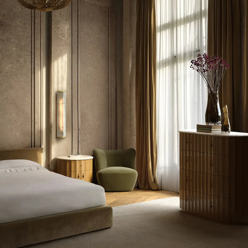 The Ondara Dresser brings richness to the bedroom through its signature vertical fluting in luminous champagne eucalyptus. A honed travertine top adds cool tactility and natural veining, grounding the warmth of the exotic wood veneer. Five spacious drawers feature custom cast brass tassel pulls. This handcrafted piece embodies refined glamour and a touch of modern classicism.