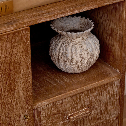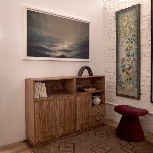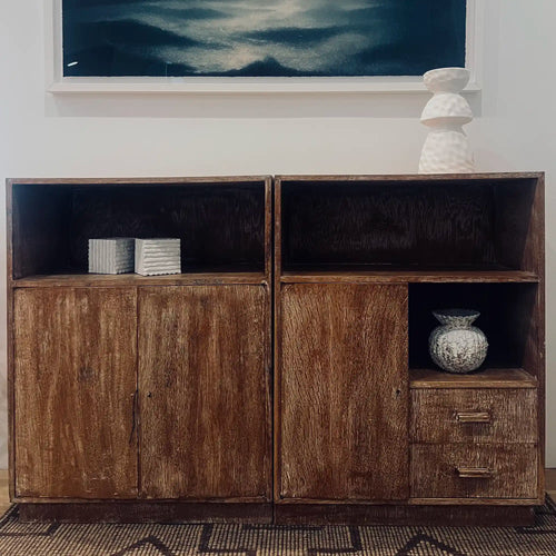 Inspired by Jean-Michel Frank and Jeanneret, this pair of oak cabinets blends sculptural design with practical function.