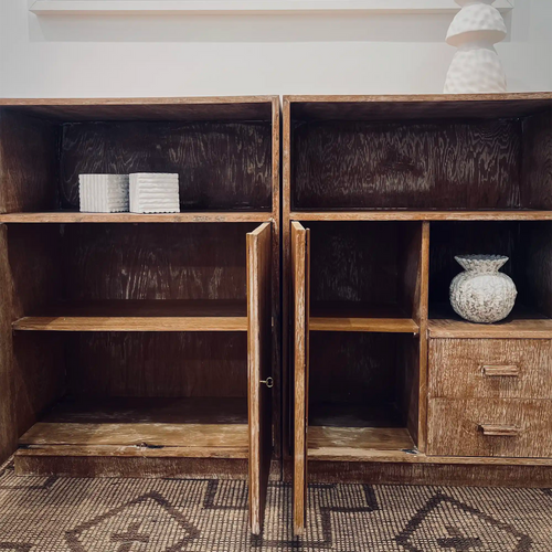 One features double doors with spacious storage, while the other offers open shelves, small drawers, and a small compartment—perfect for books, objects, or daily use.