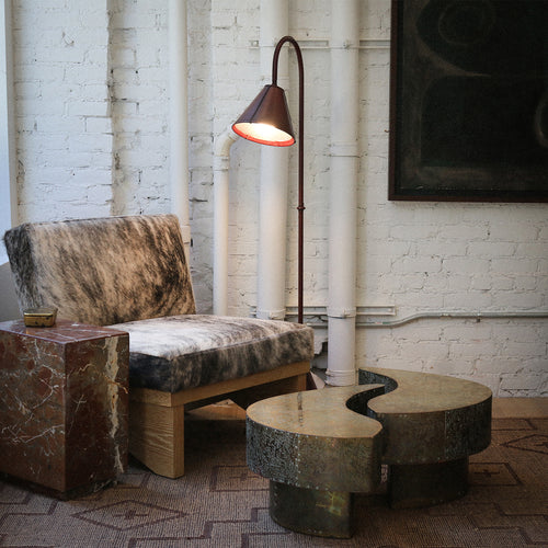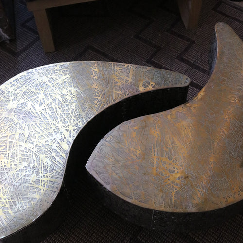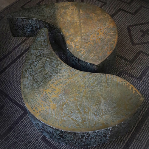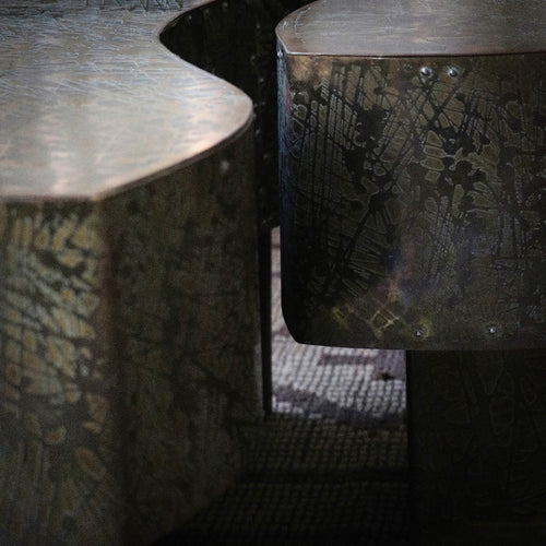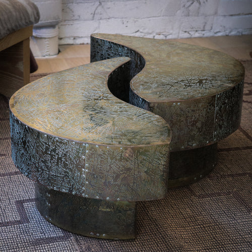 These extraordinary etched brass tables, in the manner of Paul Evans, embody the raw beauty and sculptural presence that define mid-century design at its most avant-garde. Their interlocking, biomorphic form is a testament to the era’s fascination with organic modernism, while the richly textured brass surface has a gorgeous luminous patina. A striking addition to the Lemieux Et Cie vintage collection, these tables bridge the artistry of 20th-century studio furniture with a distinctly contemporary sensibility.