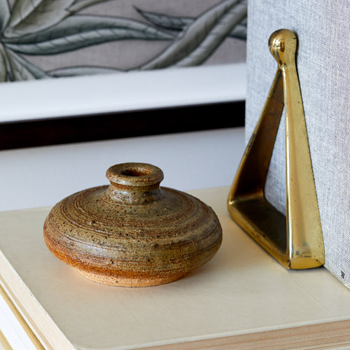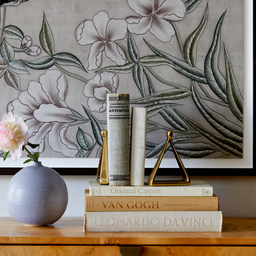 Standing at 6 inches in height, these sturdy bookends offer reliable support while serving as stylish accents. The midcentury geometric shape exudes a minimalist charm that is at once bold and understated, making these bookends a versatile addition to any room. Whether holding up vintage tomes or showcasing art books, these brass bookends are sure to make a literary statement.