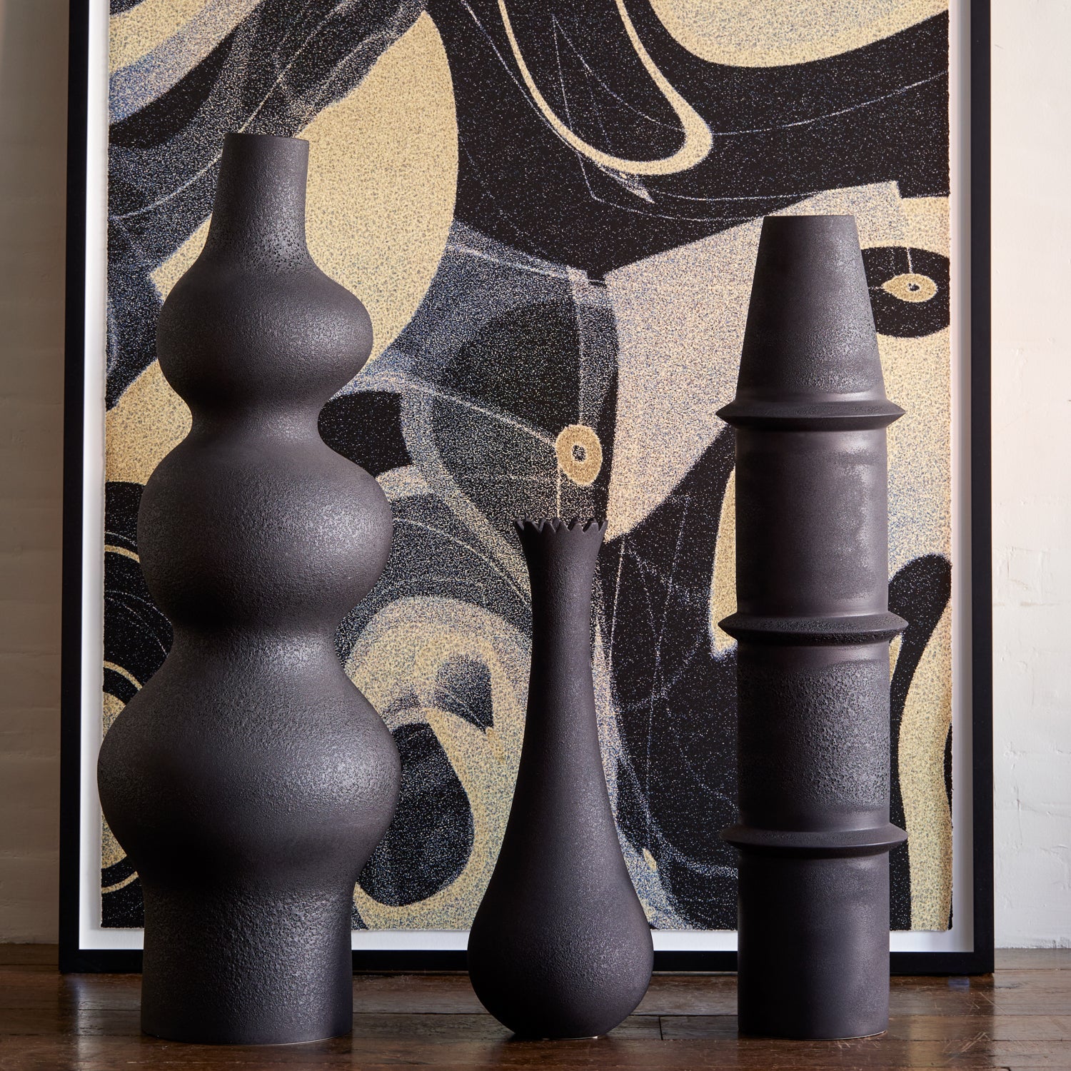 The Overscale Vases in Black combine scale and organic form for decorative drama. The Panisse vase with its tall cylindrical form, adds drama to any space. Whether alone or in a grouping, these vases are the perfect graphic elements to complement any decor. Listed from left to right as shown in the last image: Deoune Vase, Pasteur Vase, Fenouil Vase, Panisse Vase, and Muguet Vase.
