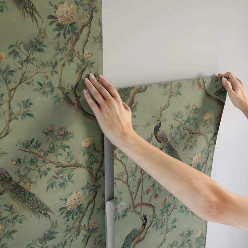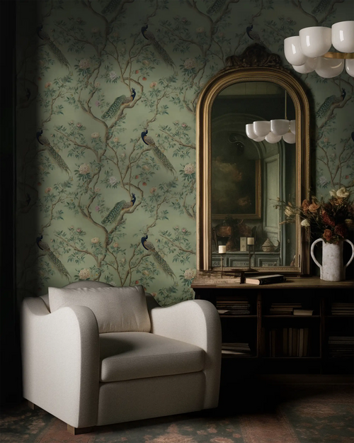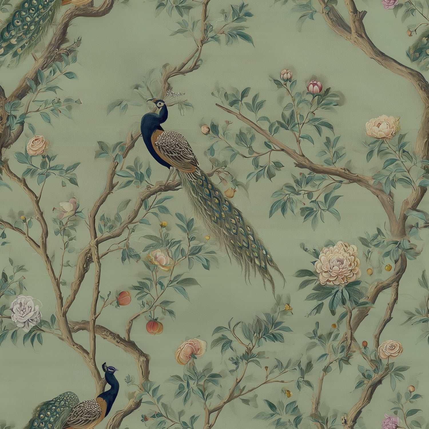 Drawn from our archival collection, Peacock Plume celebrates the timeless allure of its namesake bird. Perched among flowering branches, its sweeping tail unfurls in intricate layers of pattern and light, each feather rendered with painterly precision. Inspired by antique hand-painted murals, itis a study in movement frozen at its most extravagant moment.