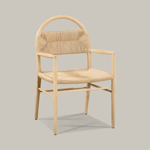 A solid wood arched frame threads through a woven rush seat with arms and backrest to form this well-proportioned, minimalist chair for dining, desk, vanity or an accent in any room. Available in cerused European oak or walnut finishes.