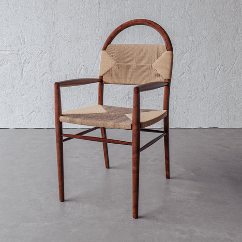 A solid wood arched frame threads through a woven rush seat and backrest to form this well-proportioned, minimalist chair for dining, desk, vanity or an accent in any room. Available in cerused European oak or walnut finishes.