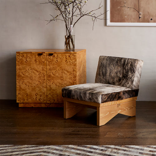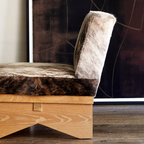Soft, minimalist forms combine into an armless chair with a sculptural base that celebrates wood and the legacy of French designer Pierre Jeanneret. This photo shoot sample can be viewed in our atelier, and is available now for local pickup and delivery.