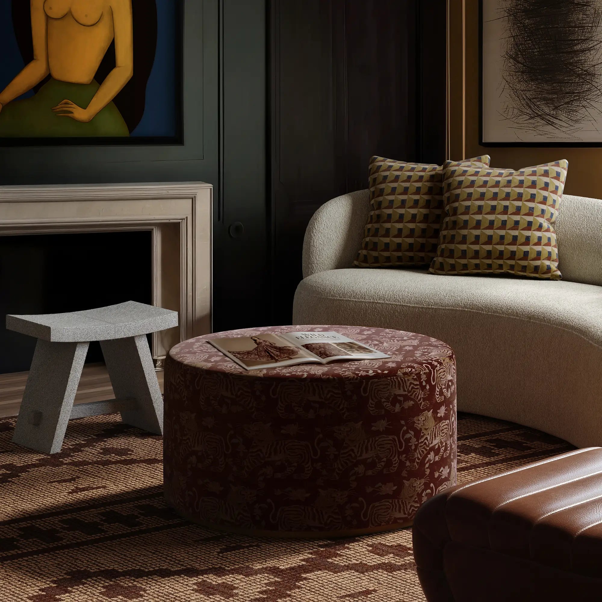 The Pierre Stool draws from Japanese wabi-sabi, a design philosophy that celebrates natural imperfections and organic beauty. Each hair-on-hide cover has its own unique pattern and texture, showing off the material's true character. The clean silhouette reflects mid-century Scandinavian influences through a Japanese lens, where form recedes to let material speak. Lightweight and versatile, it works beautifully as an accent beside a sofa, in a dressing room, or at the foot of a bed.