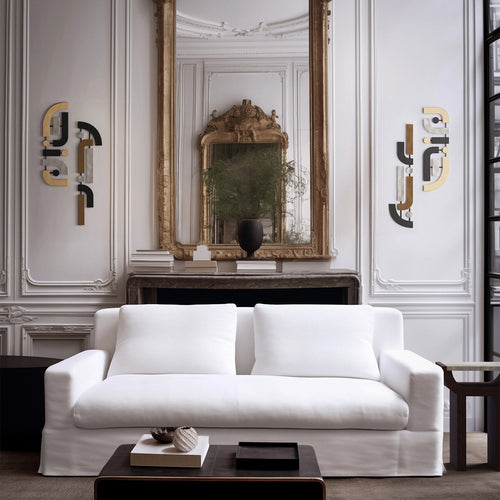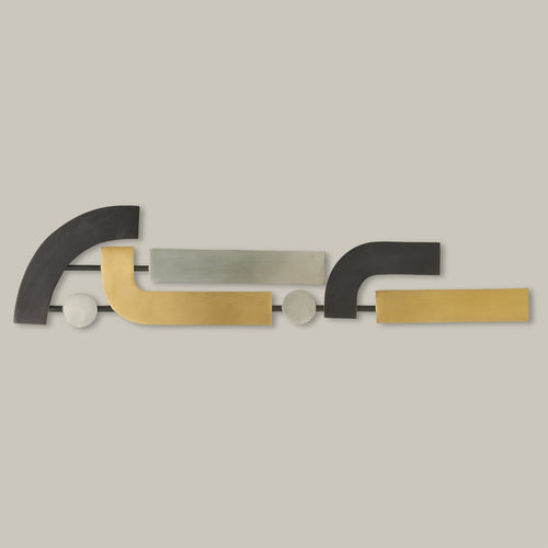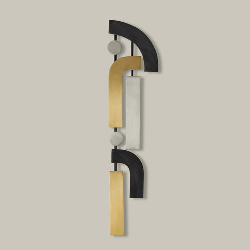 This striking decorative wall sculpture features hand-cut brass geometric shapes, showcasing multiple metal finishes combined into one stunning art piece. The varying textures and colors create a dynamic visual appeal, making it a captivating focal point for any room. Versatile in its design, this sculpture can be hung both horizontally and vertically, allowing for flexible placement to suit your space. Each piece is crafted with precision, ensuring a unique and high-quality addition to your home decor.