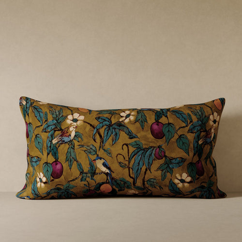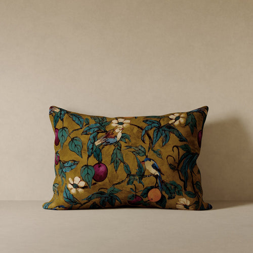 A lush celebration of fruiting branches and songbirds, the Plum Garden decorative pillow brings a historic chinoiserie motif into modern design. Jewelled plums, apricots, and blossoms unfold across a deep ochre background, their brushwork recalling antique garden murals. Crafted in JB Martin performance velvet and made to order in the USA, it brings warmth and painterly depth to the home.