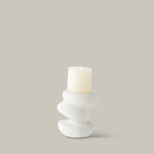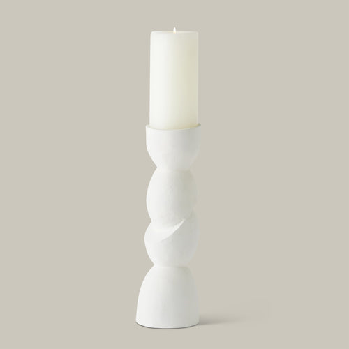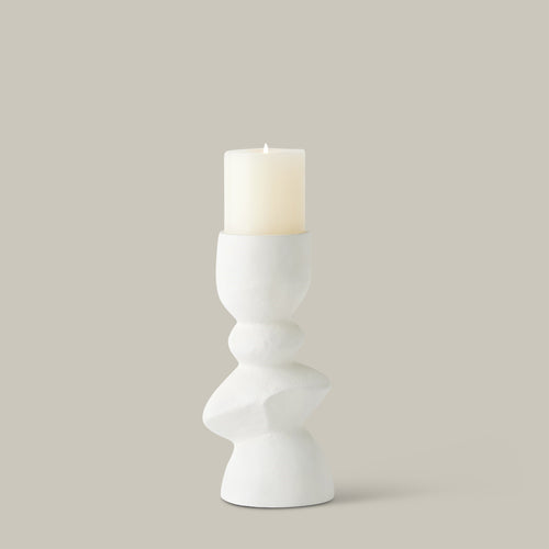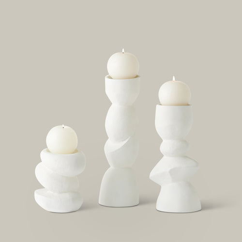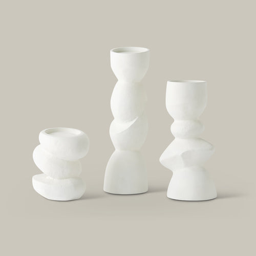 This collection of hand-cast aluminum pillar candle holders features undulating organic shapes that create a modern, natural aesthetic. Each holder features a unique form, combining a softly textured white finish with fluid lines for a balanced modern and natural look. Perfect for adding a touch of elegance and warmth to any setting, these candle holders are both functional and artistic. Whether used individually or grouped together, they bring a sophisticated and serene ambiance to your home decor.
