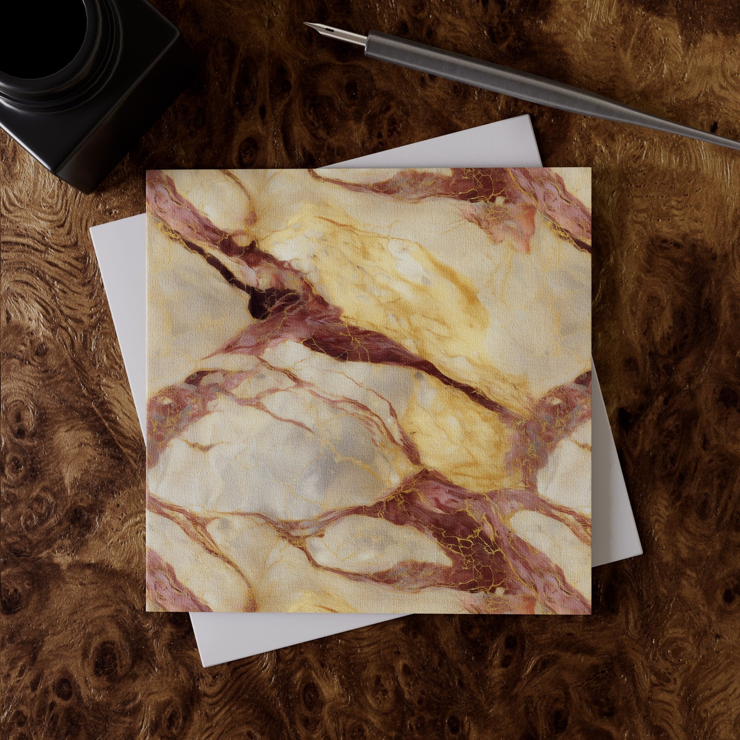 Infused with the romance of Italian marble and hand-painted stone, Rosa Aurora glows with rose veining and ribbons of gold and ivory. Meaning "pink dawn," it captures warmth, light, and new beginnings. A premium greeting card, printed on fine art linen paper with a white envelope, ready to give. Pairs beautifully with our matching gift wrap paper.