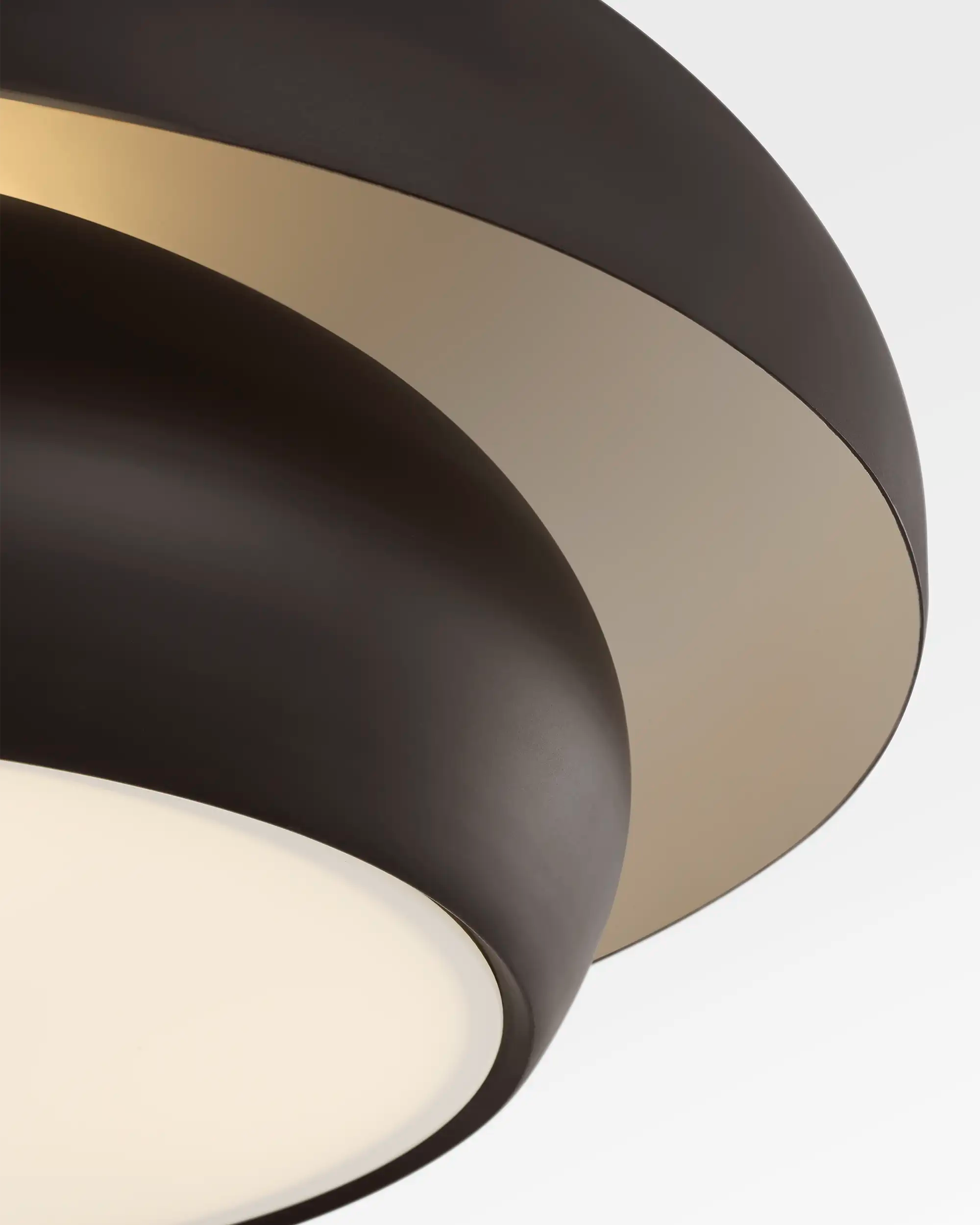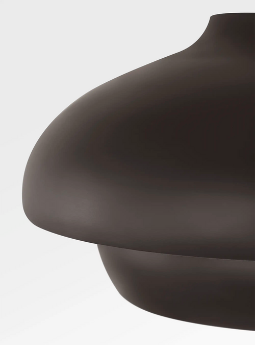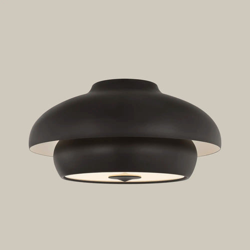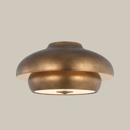 Designed for dining rooms, living rooms, libraries, and hallways with lower ceilings, the Solene Flush Mount features a nested dome silhouette that diffuses light downward and outward to create a soft, layered glow. Its tiered domes give the effect of floating light, offering an elliptical, sculptural presence overhead. Named for the French word meaning “dignified,” Solene brings a quiet sense of ceremony to any room. Inspired by the minimalism of Jean Royère and the refined geometry of Jacques Adnet, its form recalls modern Parisian design. Crafted in aged iron or gilded brass and hand-patinated to a warm, time-worn sheen, Solene turns ceiling lighting into sculpture.