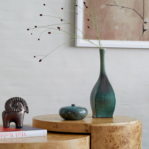 Ideal for small floral arrangements or as a standalone accent piece, this bud vase brings a touch of midcentury modern charm to any space. Its understated design makes it versatile enough to work with a variety of interior styles, while the reactive glaze adds an artistic flair that sets it apart as a decorative gem.
