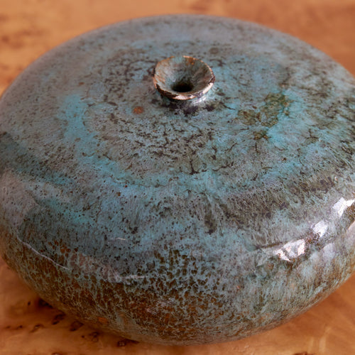 This squat midcentury bud vase combines elegant simplicity with a striking reactive glaze that gives it an artisanal, one-of-a-kind quality. Measuring 6 inches in diameter, the vase's low, rounded form is beautifully complemented by its unique surface finish, showcasing a range of rich, earthy tones and textural details that evoke a natural, organic feel.