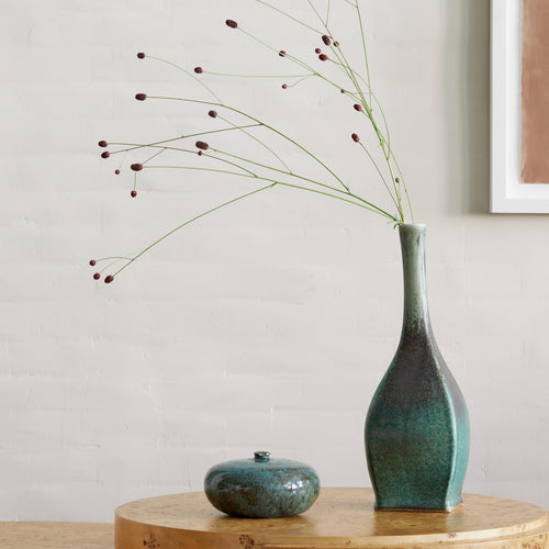 This striking tall midcentury vase is a true statement of modernist artistry, defined by its angular form and stunning reactive glaze. Standing at 16 inches in height, its clean lines and elegant silhouette add an eye-catching architectural element to any space. The reactive glaze lends a unique, organic quality to the surface, with beautiful variations in color and texture that make each piece one-of-a-kind.
