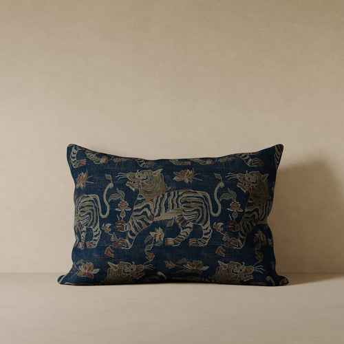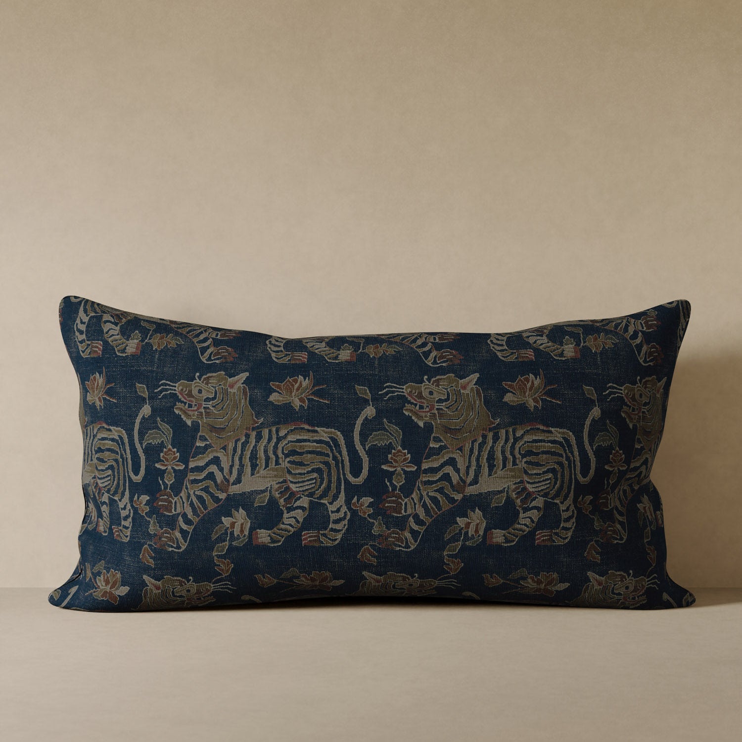 A bold reinterpretation of the Tibetan tiger rug, the Tiger Indigo decorative pillow channels its enduring spirit of protection and power. Once symbols of bravery and guardianship, these motifs are reimagined in a deep indigo palette with softly aged detailing, woven in JB Martin performance velvet. Made to order in the USA, it layers heritage and sophistication in equal measure.