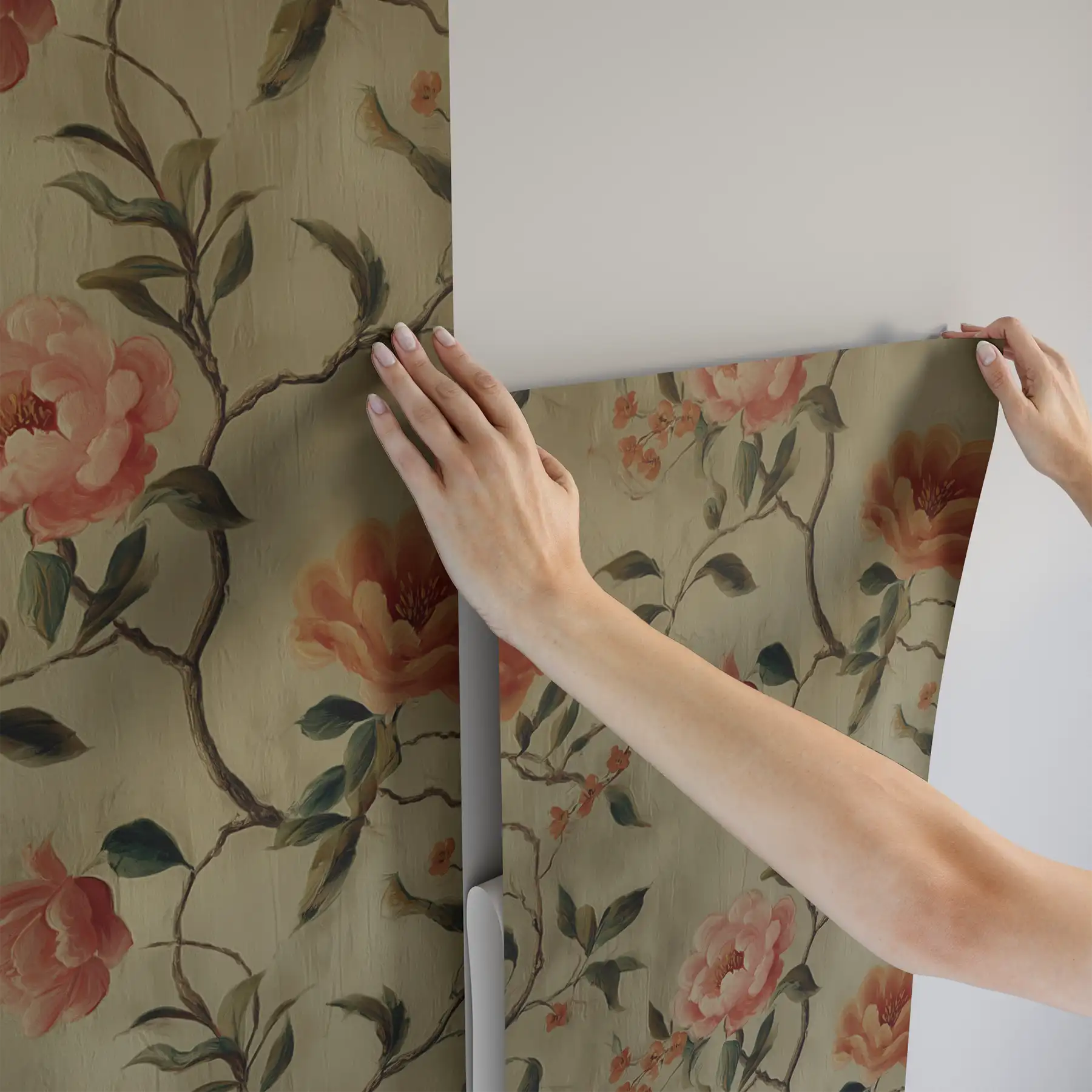 Echoing the beauty time leaves behind, Trellis Bloom layers hand-drawn blossoms and winding branches across a softly patinated surface. The design recalls the faded murals of old European homes, their color and texture mellowed by age. In tones of coral and green, it captures the charm of antique-inspired chinoiserie wallpaper, a timeless choice for those who love warmth, artistry, and history made livable.