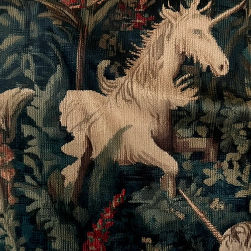 Unicorn Holiday reimagines the magic of medieval tapestries through verdant flora, mythical creatures, and rich woven texture. Evocative of storytelling textiles from centuries past, it is rendered in JB Martin performance velvet with depth and luminosity. Made on demand in the USA and available by the yard, it suits custom drapery, upholstery, or Customer’s Own Material (COM) furniture projects, bringing a sense of legend and luxury to modern interiors.