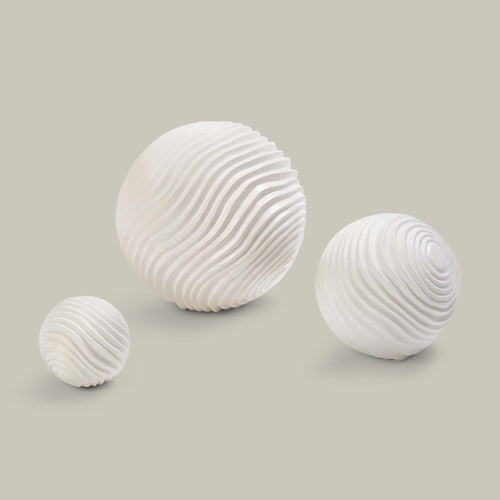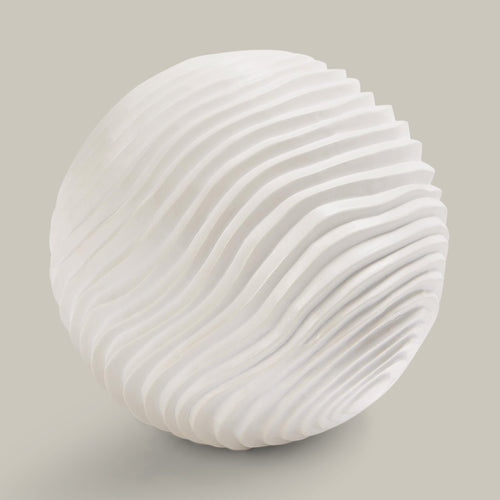 Hand-thrown in a matte ceramic, this sculptural sphere recalls the elemental geometry of Brancusi. Pure, tactile, and resolute, an etched surface invites a dialogue of shadow and reflection, grounding the room in quiet rhythm. Whether placed alone or in a considered composition, it becomes more than decor: an artifact of presence and restraint.