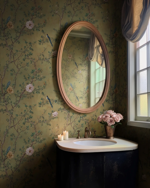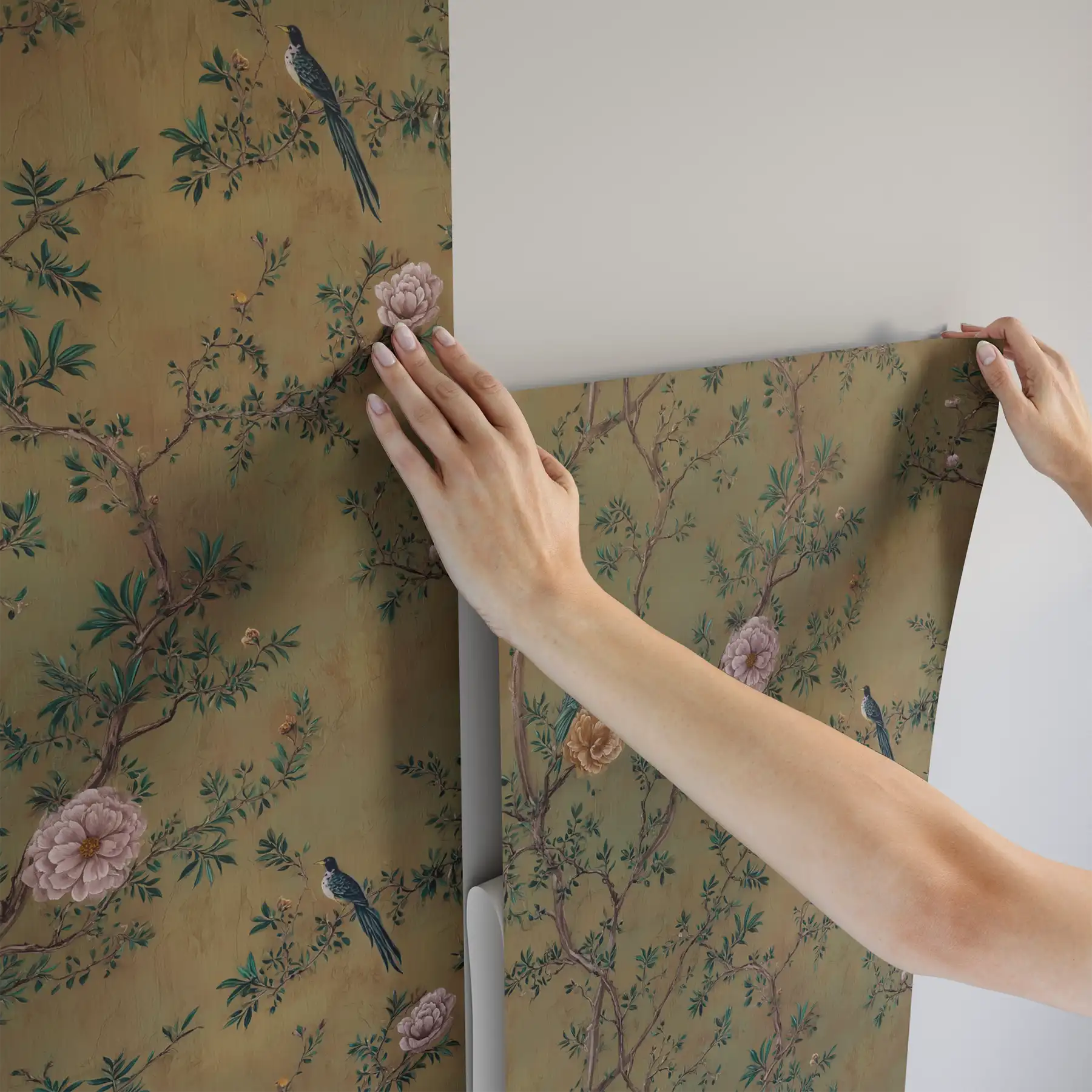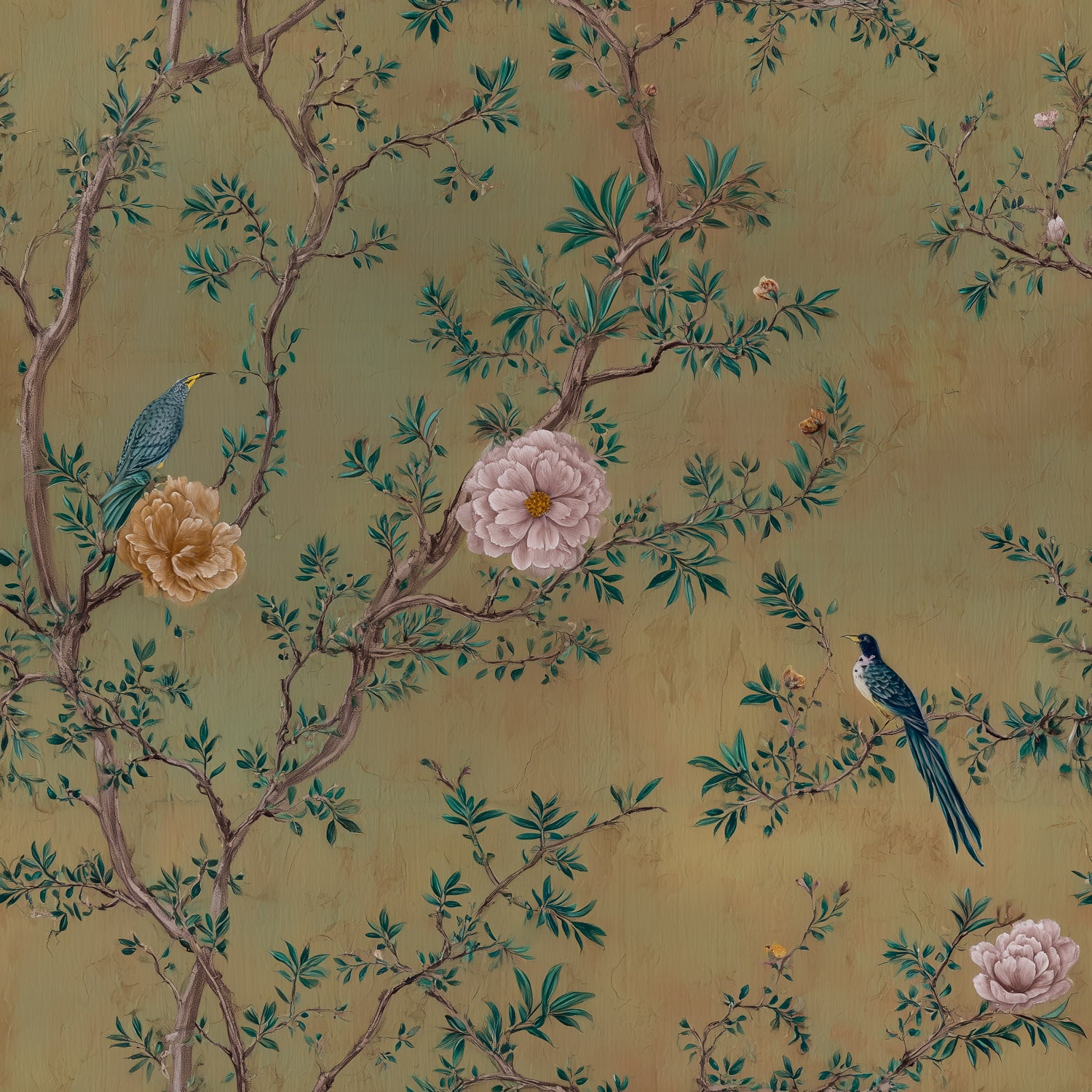 Softly rendered branches and birds drift across a tranquil blue-green wash in Vertivier, a composition that invites calm. Peonies and foliage are rendered in nuanced tones that recall painted silk, giving the surface layered dimension and subtle movement. The result is a fresh expression of chinoiserie wallpaper, created for interiors that invite lingering.