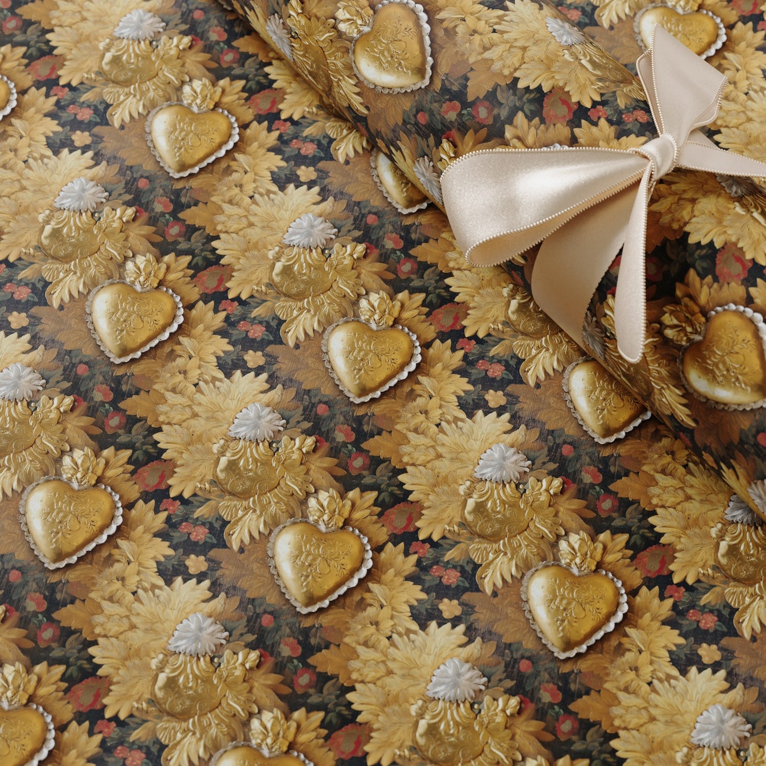 Victorian Locket is fancy gift wrapping that draws from 19th-century sentimental jewelry, when heart-shaped lockets held portraits and keepsakes. This gold wrapping paper reflects the romantic style of the Victorian era, influenced by jewelers like Charles Lewis Tiffany and the ornamental floral work of William Morris. Nostalgic and richly layered, this premium wrapping paper is ideal for elegant, high-quality gift wrapping.