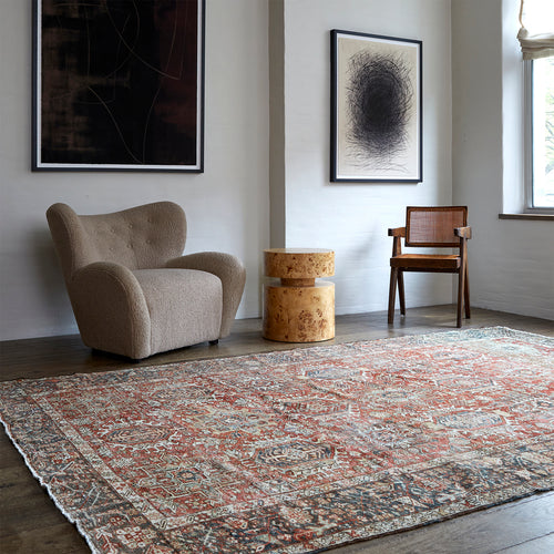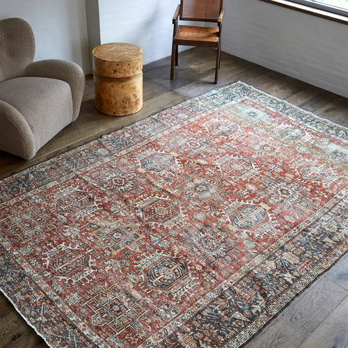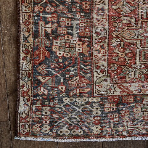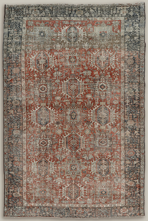 The city of Heriz is located roughly 60 miles from the legendary carpet-producing city of Tabriz. Since the early 19th century, Heriz has been producing European-sized carpets that define the angular style of northwest Persian rugs. Heriz rugs are known for having glorious color, with rich reds, blues, greens, and yellows. Much of the formal vocabulary, drawing, and color sensibility of these rugs is traceable to the classical antique Caucasian rugs of the eighteenth and seventeenth centuries. circa 1960