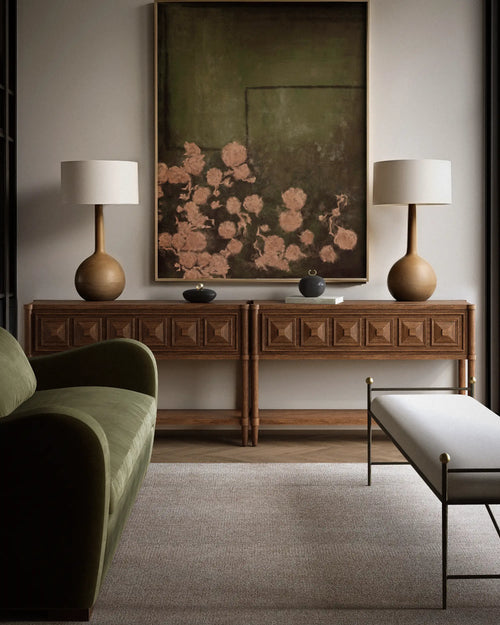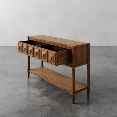 The Voltaire Console Table blends wire-brushed oak with a geometric silhouette inspired by the quiet glamour of French Art Deco. Two full-width drawers integrate seamlessly into the design, preserving the architectural line while providing hidden storage. Hand-finished surfaces reveal dimensional grain, and subtle faceting along the top and legs adds shadow and structure, creating a modern expression of proportion.