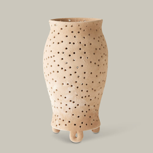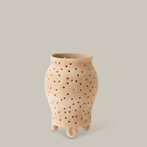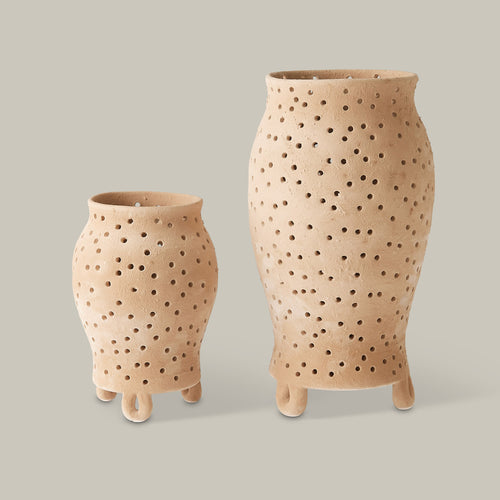 The Yassine Candle Holder Collection by Lemieux et Cie honors Moroccan ceramic artistry with its hand-perforated, urn-shaped design. Crafted to let candlelight dance through its organic form, it blends warmth, texture, and tradition.