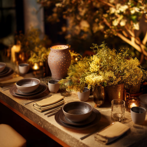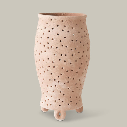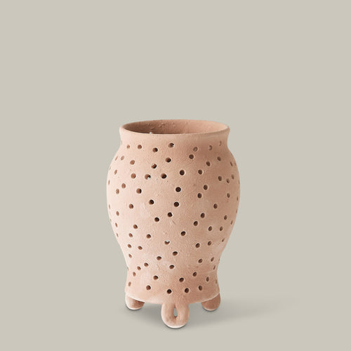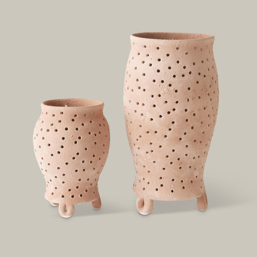 The Yassine Candle Holder Collection by Lemieux et Cie honors Moroccan ceramic artistry with its hand-perforated, urn-shaped design. Crafted to let candlelight dance through its organic form, it blends warmth, texture, and tradition.